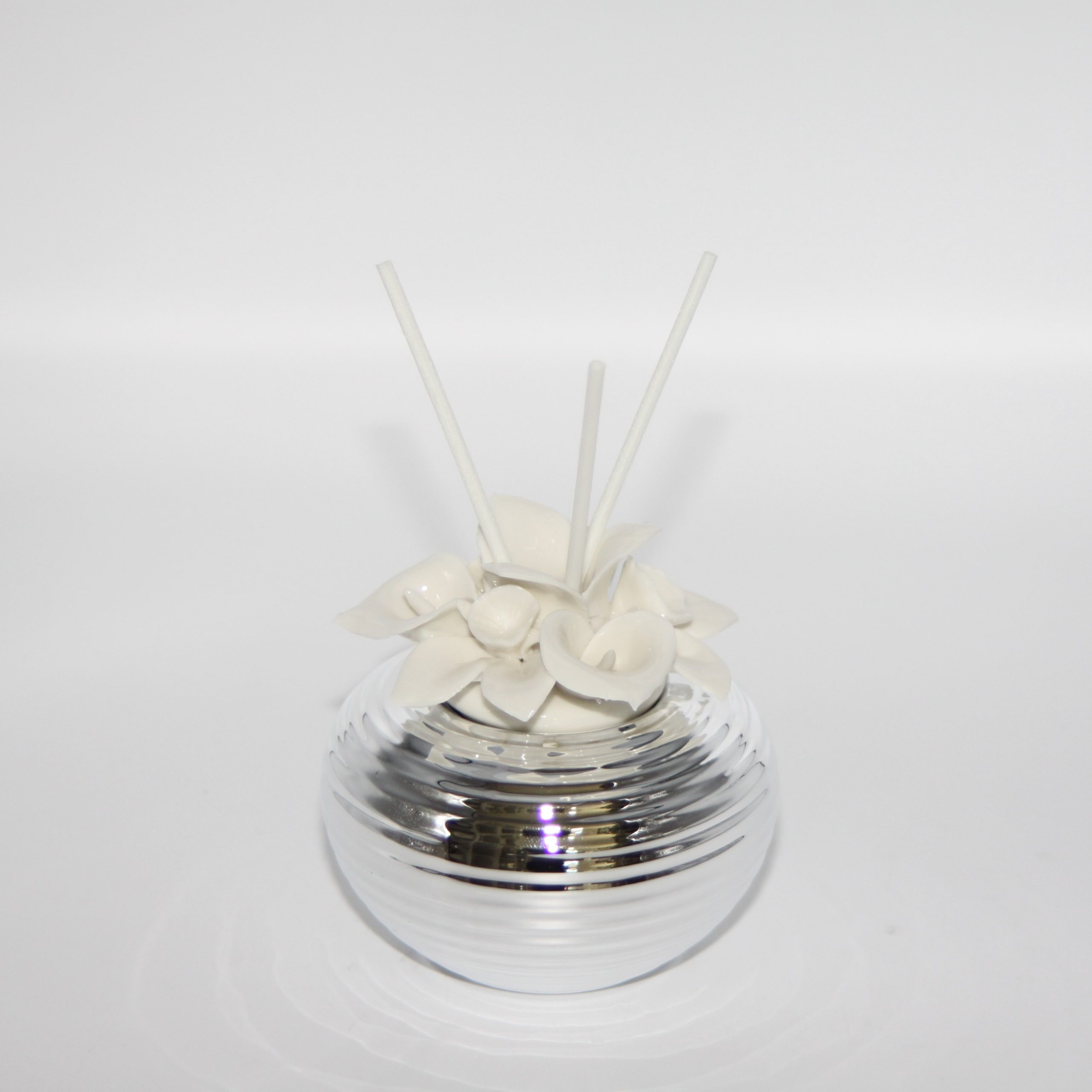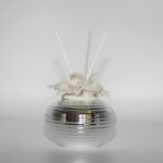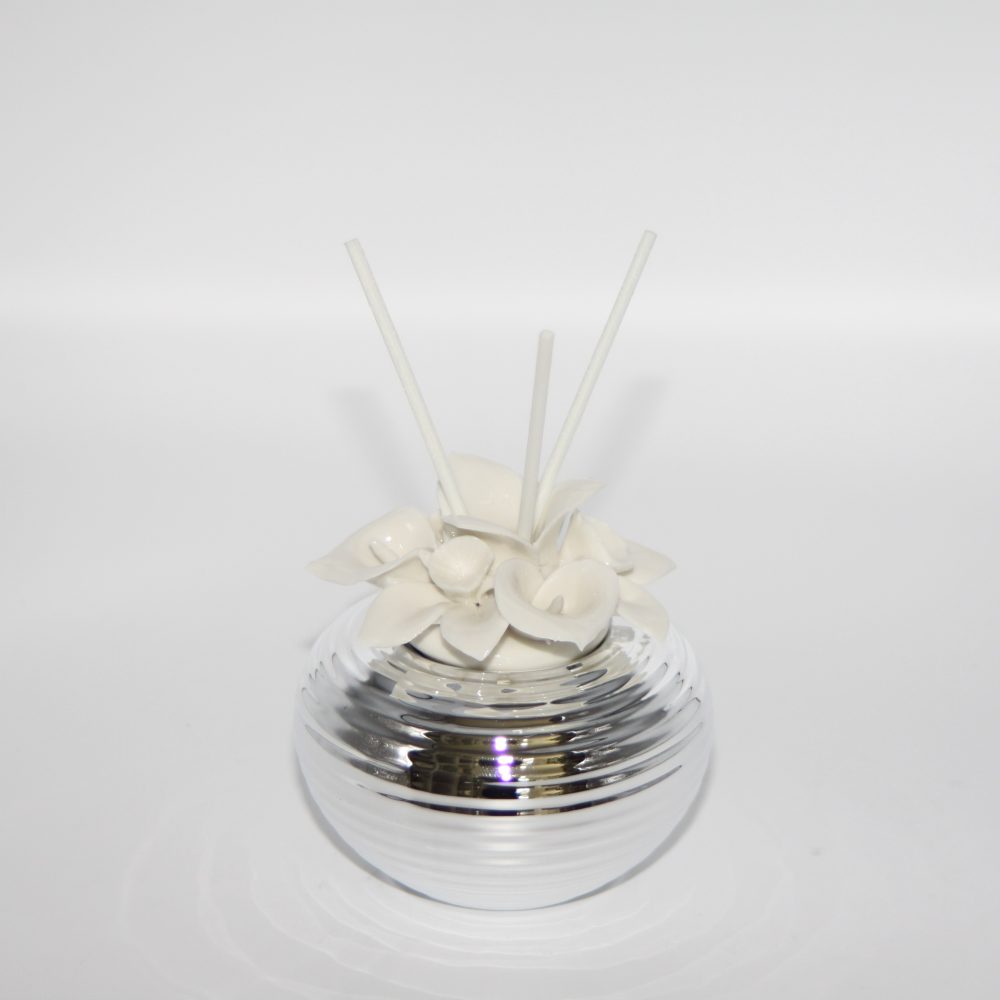 Profumatore per ambienti con decorazioni di calle in porcellana sulla parte superiore e base in argento. Un’idea semplice ed utile per essere usata come bomboniera nel giorno della vostra cerimonia. Va bene per verie cerimonie, con scatola, fragranza e midollini inclusi. Dimensione: 10×9 cm