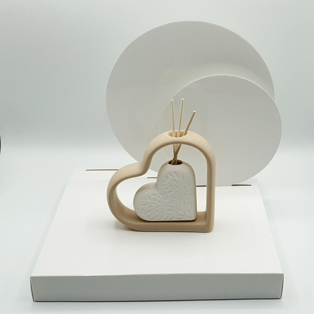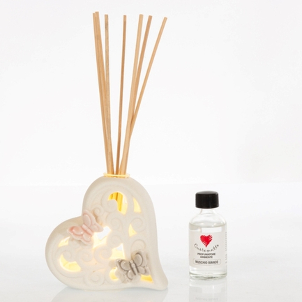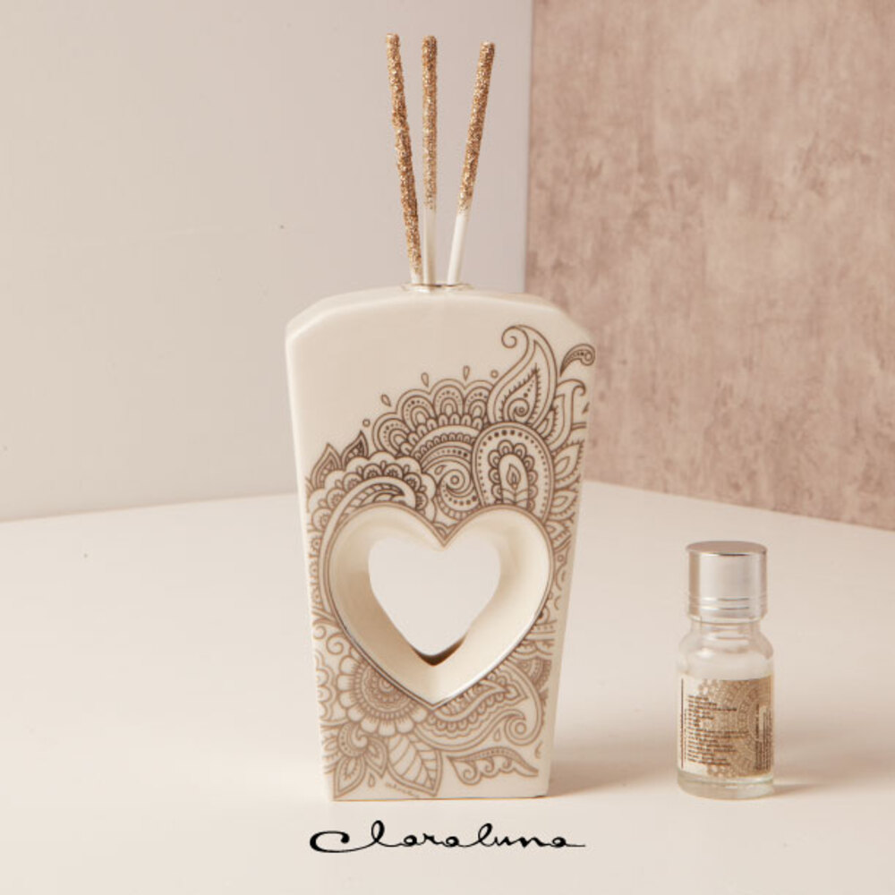 Profumatore forma rettangolare che ha la funzione di diffusore grazie alla presenza di essenze e bastoncini con glitter. La decorazione di cuore e il damascato lo rendono particolare ed elegante allo stesso momento. Dimensione: 8x7x3,5. Guarda qui tutti gli articoli Claraluna e scegli il tuo preferito!