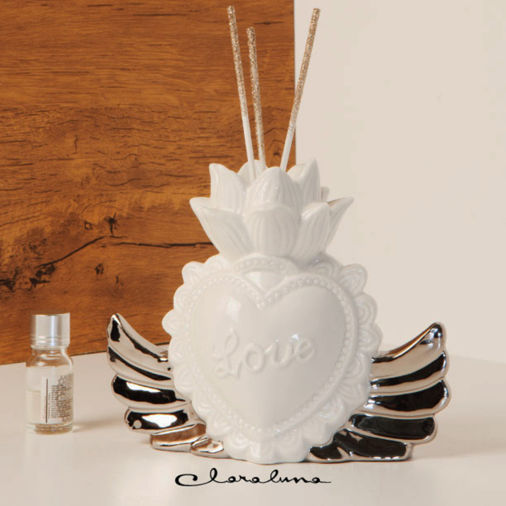 Profumatore cuore con decorazioni di ali che simboleggiano l’amore in tutte le sue forme. Il profumatore è compreso di kit essenza e bastoncini con brillantini. Dimensione: 17,5×6,5×15 cm. Guarda qui tutti gli articoli Claraluna e scegli il tuo preferito!