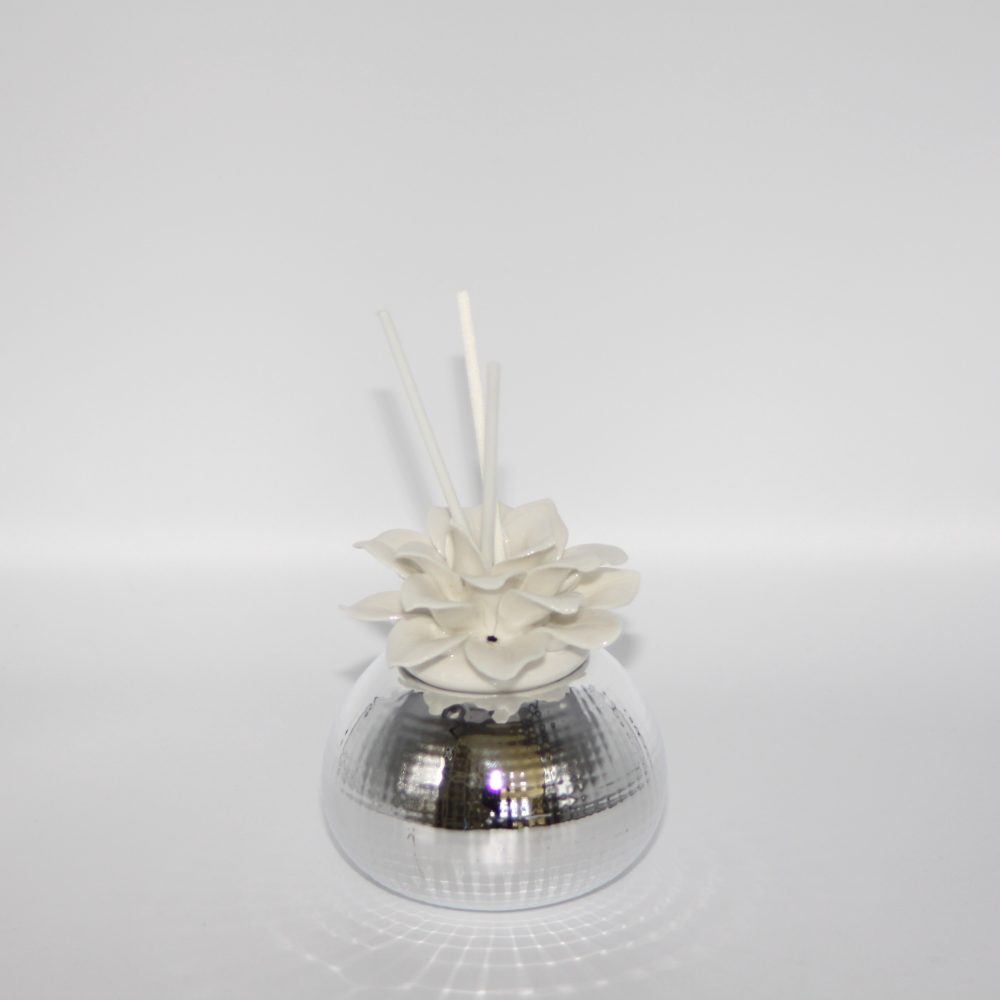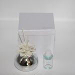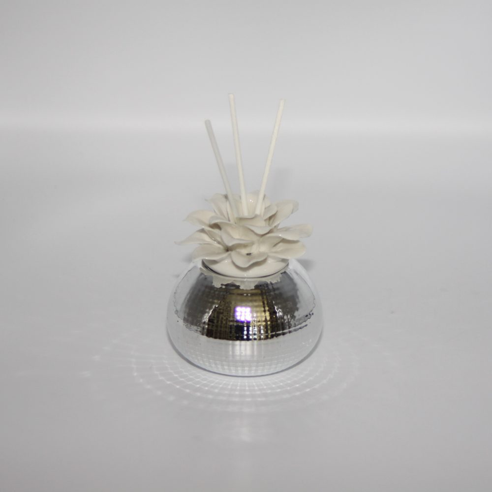 Profumatore per ambienti con decorazioni di fior di loto in porcellana sulla parte superiore e base in argento. Un’idea semplice ed utile per essere usata come bomboniera nel giorno della vostra cerimonia. Va bene per varie cerimonie, con scatola, fragranza e midollini inclusi. Dimensione: 10×9 cm