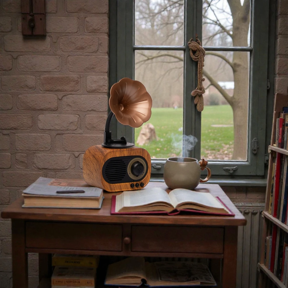 Nonostante il suo aspetto antico, la Radio Speaker Grammofono è dotata di tecnologia attuale che assicura un ascolto piacevole. È pensata per essere un piccolo speaker adatto a diffondere musica o suoni d’ambiente, offrendo una qualità sonora equilibrata. La combinazione tra estetica e utilità la trasforma in un accessorio perfetto per la casa, l’ufficio o per un angolo dedicato alla musica.
