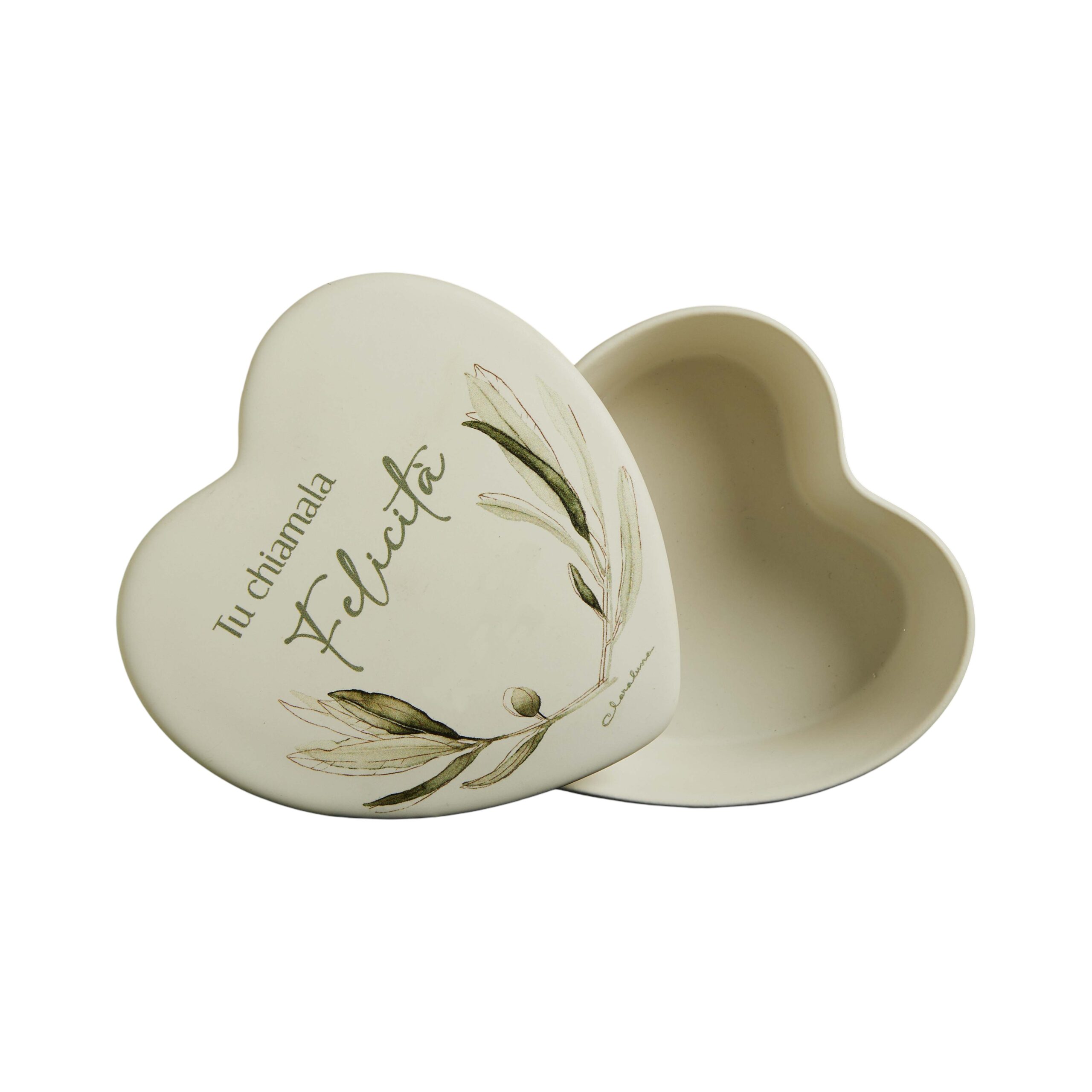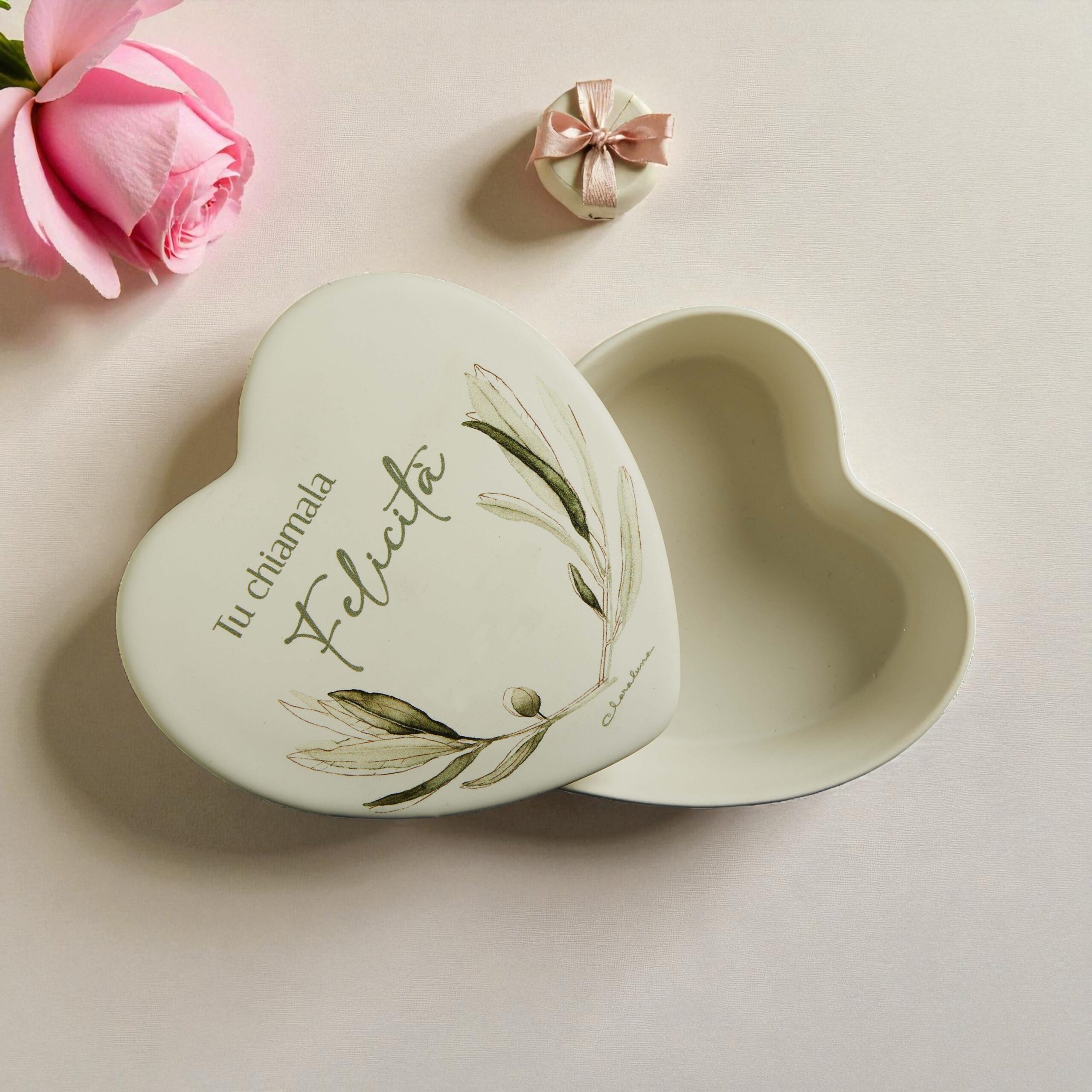 La scatolina foglie d’ulivo a forma di cuore è una bomboniera elegante e simbolica, pensata per custodire piccoli tesori e grandi ricordi. Perfetta per matrimoni, battesimi, comunioni e anniversari, rappresenta un gesto d’amore che dura nel tempo.