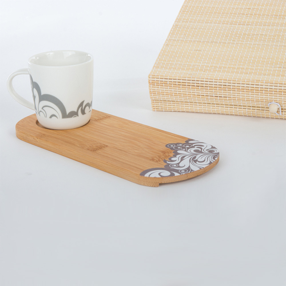 Set da colazione composto da tazza in ceramica decorata e base in legno stampato grigio e bianco. Scatola regalo in bambù inclusa. Dimensione: 10×26 cm