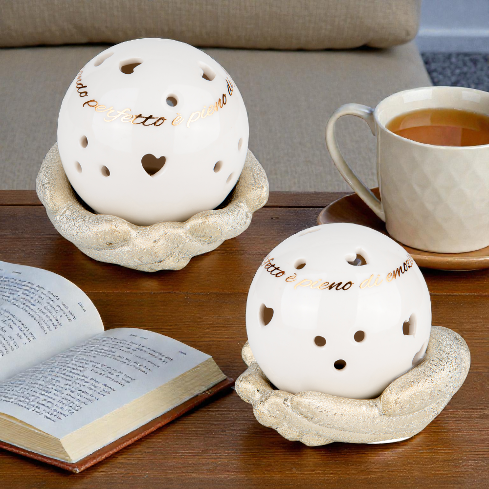 Il design si distingue per l’equilibrio tra semplicità ed eleganza. La sfera in ceramica bianca lucida poggia su una base decorativa con effetto dorato, che richiama l’idea di una culla luminosa e valorizza ulteriormente l’oggetto. I piccoli cuori traforati creano giochi di luce delicati, ideali per ambienti come soggiorno, camera da letto, ingresso o angolo relax. Uno stile raffinato che si adatta perfettamente sia ad arredi moderni che classici.