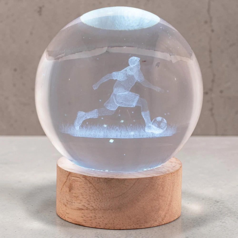 Sfera luminosa con calciatore inciso in 3D, perfetta come luce decorativa o regalo simbolico.