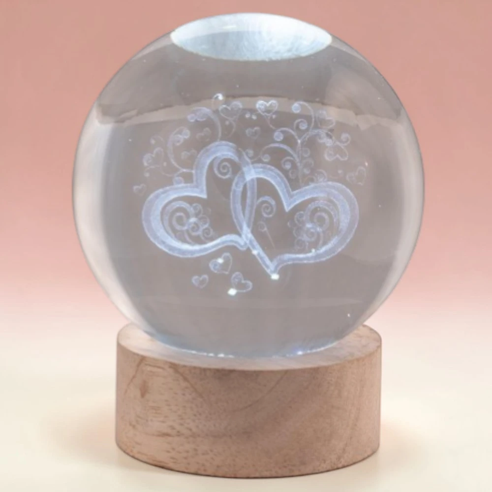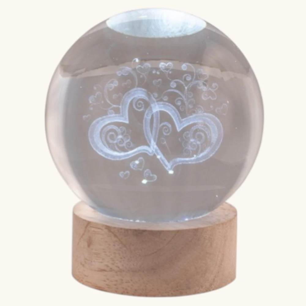 Sfera luminosa con cuori stilizzati incisi in 3D, perfetta come luce decorativa o regalo simbolico.