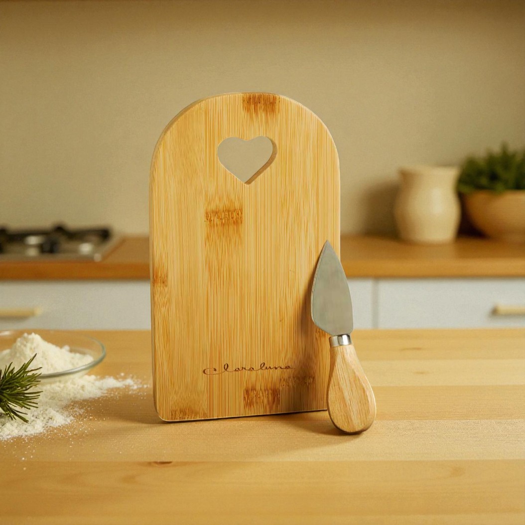 La superficie liscia e resistente del tagliere in legno è valorizzata da un foro a forma di cuore all’estremità del manico, simbolo di amore e cura. Oltre alla presenza del coltellino (incluso nella confezione) che valorizza ad ogni portata o utilizzo. Il bambù, materiale ecologico e durevole, dona calore e autenticità, rendendolo perfetto per eventi dallo stile rustico, country chic o eco-friendly.