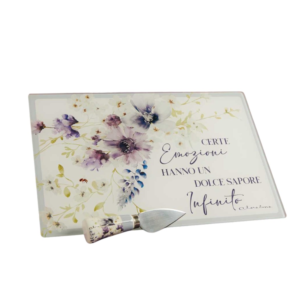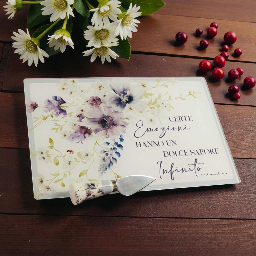 Realizzato in vetro temperato, il tagliere vetro si distingue per la sua forma rettangolare e per le delicate decorazioni floreali dai colori tenui. La scritta romantica incisa sul piano aggiunge un tocco poetico, rendendolo ideale per eventi anche grazie all’aggiunta del coltellino adatto ai formaggio e comodo per tutti gli usi, dagli aperitivi alle cene in compagnia.