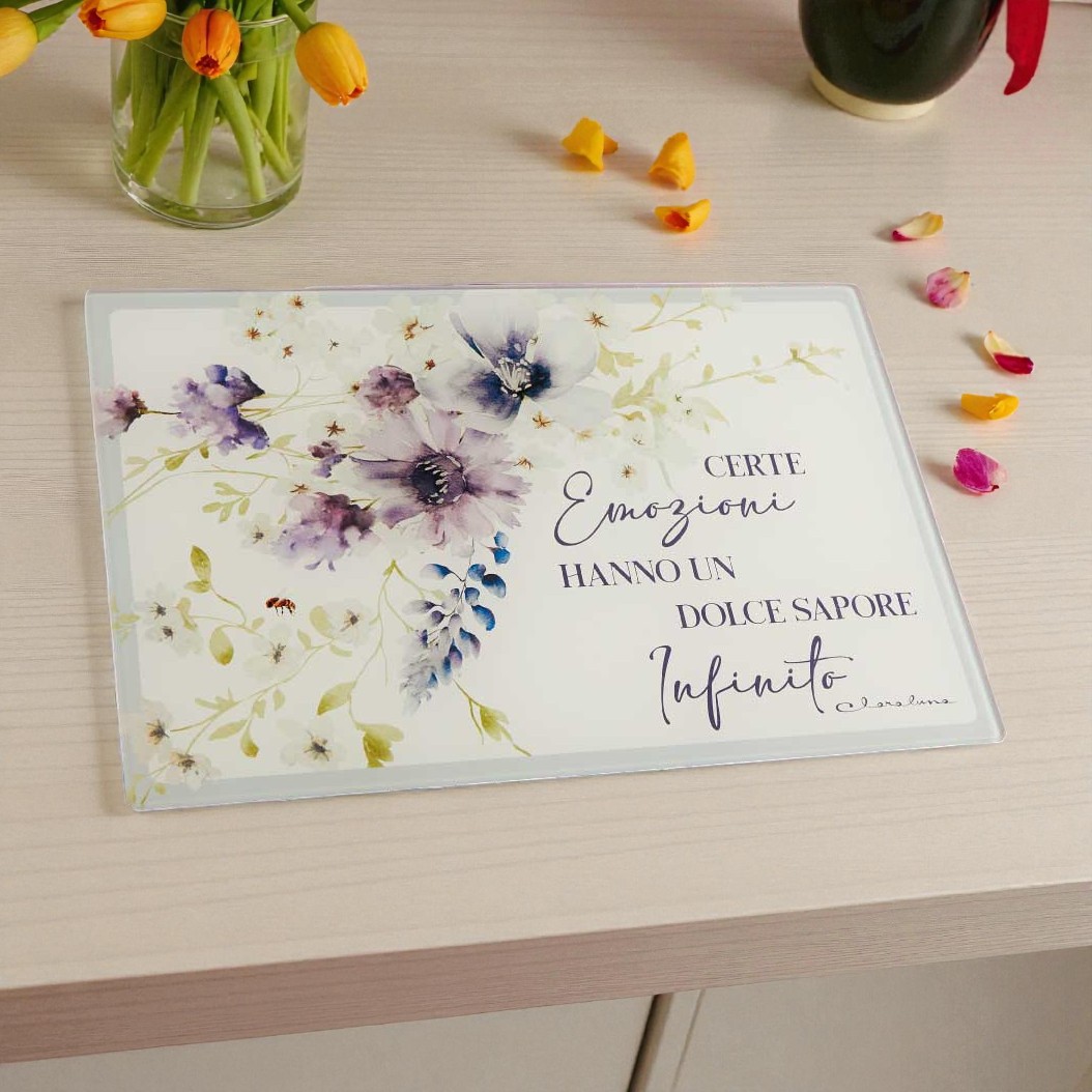 Realizzato in vetro temperato, il tagliere vetro si distingue per la sua forma rettangolare e per le delicate decorazioni floreali dai colori tenui. La scritta romantica incisa sul piano aggiunge un tocco poetico, rendendolo ideale per eventi che celebrano l’amore, la famiglia e i legami più importanti.