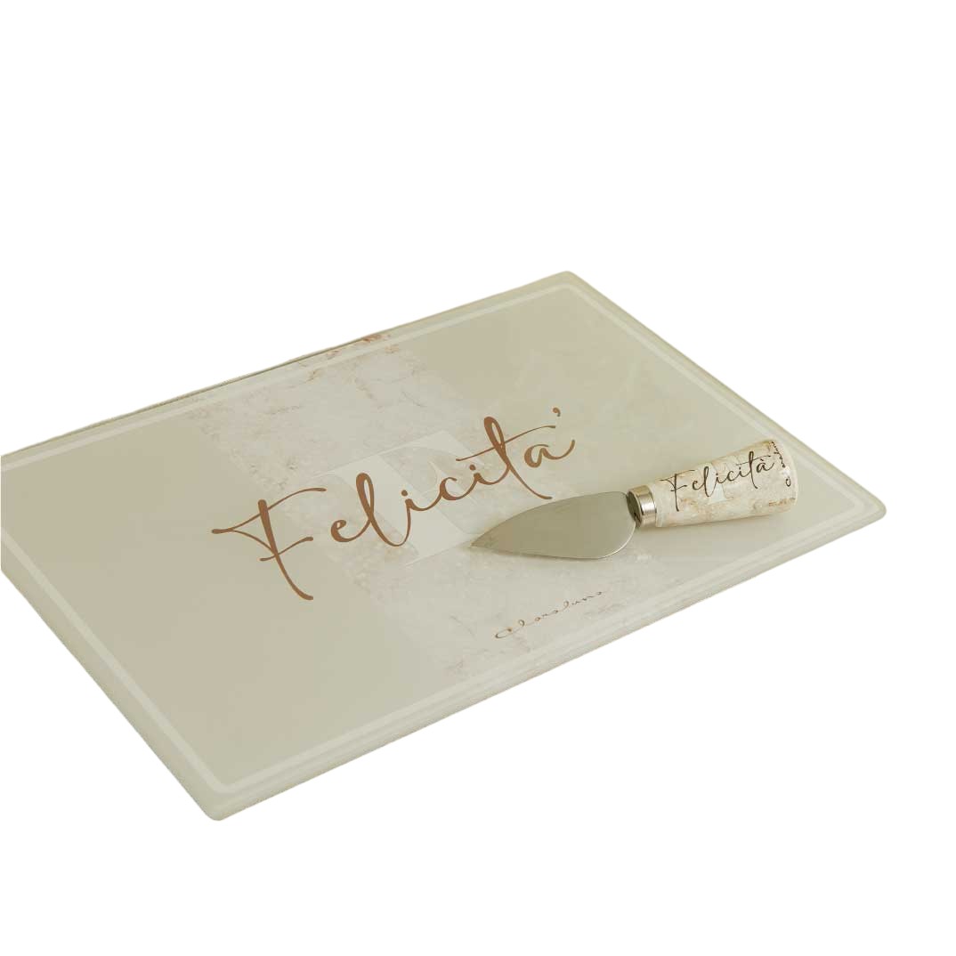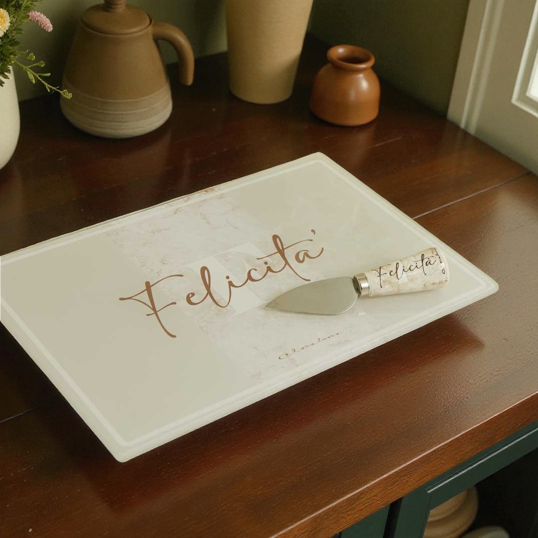 Realizzato in vetro temperato, il tagliere vetro si distingue per la sua forma rettangolare e per le delicate decorazioni dai colori tenui. La scritta romantica incisa sul piano aggiunge un tocco poetico, rendendolo ideale per eventi anche grazie all’aggiunta del coltellino adatto ai formaggio e comodo per tutti gli usi, dagli aperitivi alle cene in compagnia.