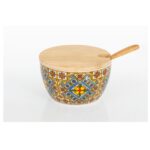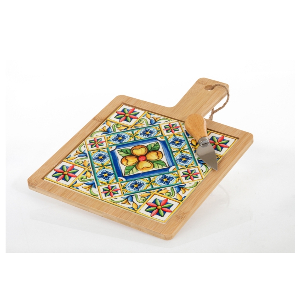 Tagliere con coltello realizzato in legno e ceramica caratterizzato da decorazioni dai toni caldi che ricordano il Mediterraneo, la sua cultura e la sua arte, ispirazione per tutta la nuova collezione 2022. Dimensione: 24x33x2 cm
