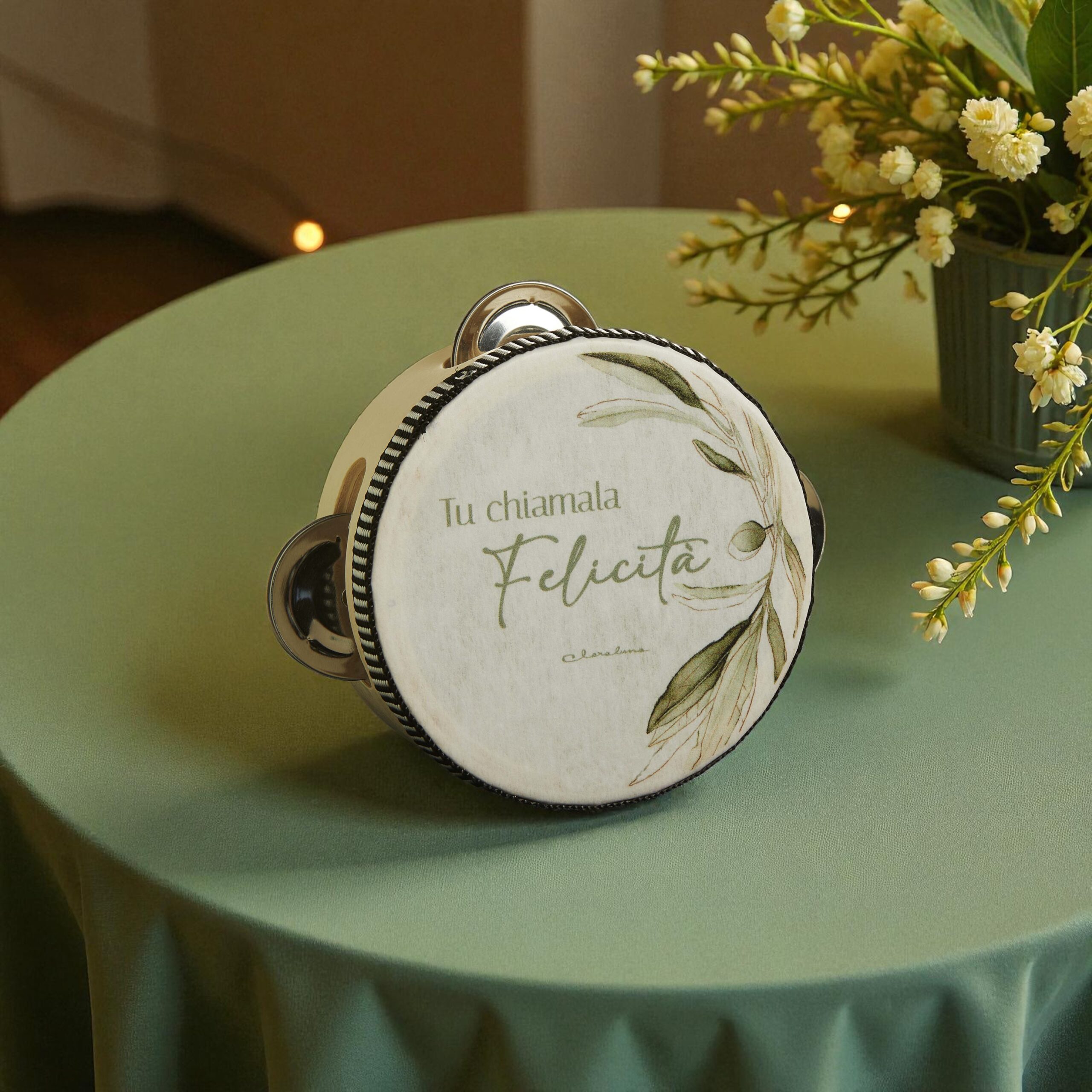 Il tamburello foglie d’ulivo non è solo decorativo, ma anche evocativo: richiama le tradizioni musicali del Sud Italia e porta con sé l’energia delle celebrazioni. Può essere esposto come complemento d’arredo o conservato come ricordo speciale, trasformando la bomboniera in un oggetto vivo e significativo.