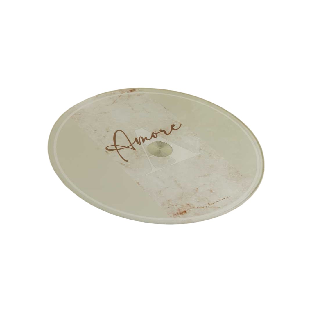 Realizzato in vetro temperato, il vassoio girevole in vetro si distingue per la sua forma rotonda e la superficie liscia e brillante. La scritta “amore”, incisa con cura, aggiunge un tocco poetico e universale, rendendolo ideale per eventi che celebrano l’amore, la famiglia e la gioia condivisa.