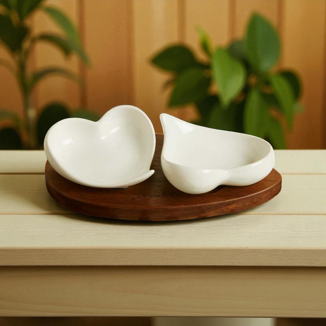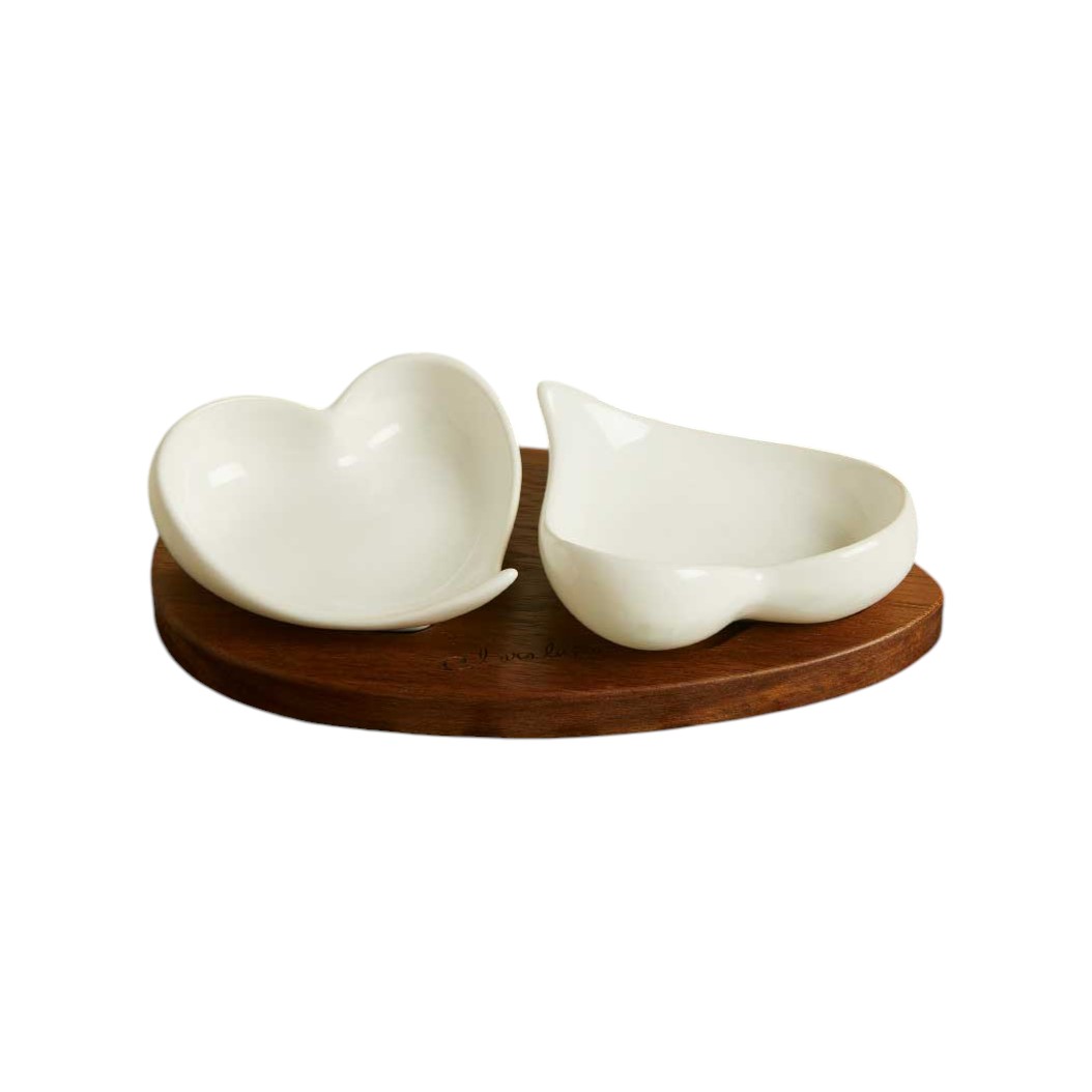 Realizzato in pregiato legno di acacia, il vassoio in legno si distingue per la sua texture calda e resistente. Le ciotole bianche in ceramica, dalla forma a cuore, aggiungono un tocco romantico e delicato, ideale per eventi dal gusto autentico, rustico o shabby chic.