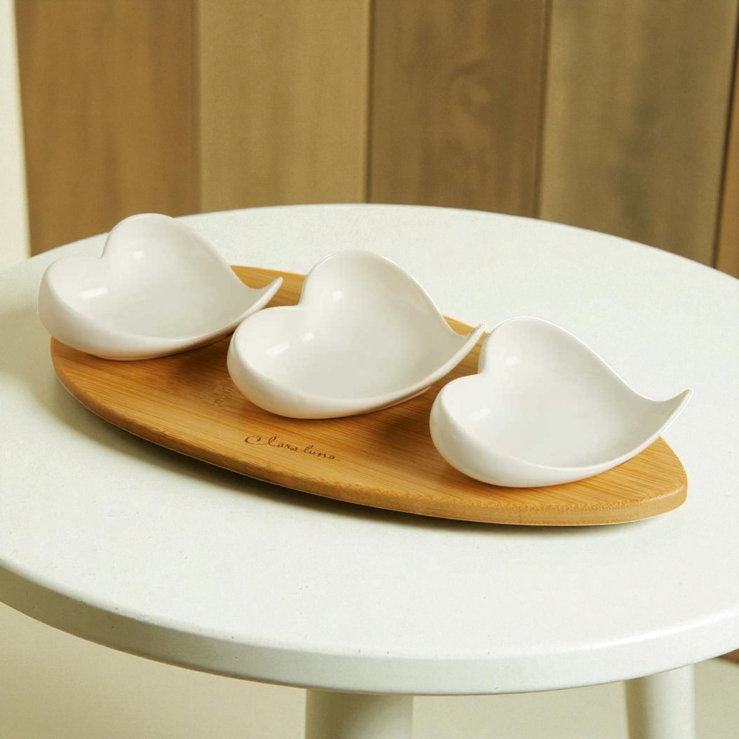 Realizzato in bambù, il vassoio in legno si distingue per la sua texture calda e sostenibile. Le ciotole bianche in ceramica, dalla forma a cuore, aggiungono un tocco delicato e romantico, ideale per eventi dal gusto autentico, rustico o minimal chic.