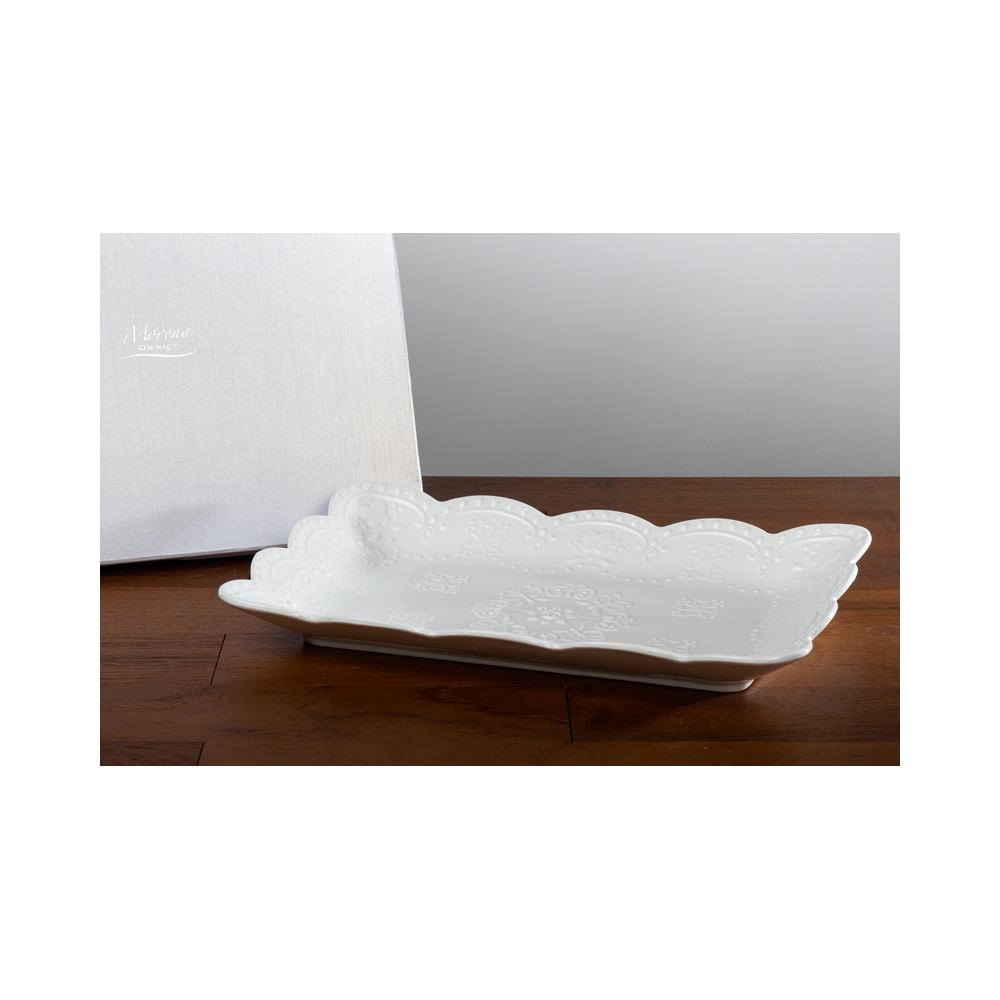 Il vassoio rettangolare in porcellana decorata fa parte della collezione Linea Bianca. Questa nuova collezione si caratterizza per il design essenziale reso elegante dalle decorazioni dalle incisioni in rilievo. La semplicità di questi articoli fa sì che possono essere scelti come bomboniera nel giorno della cerimonia e rispondere alle esigenza di tutti i gusti. La scatola regalo è compresa. Dimensione: 35x23x4 cm