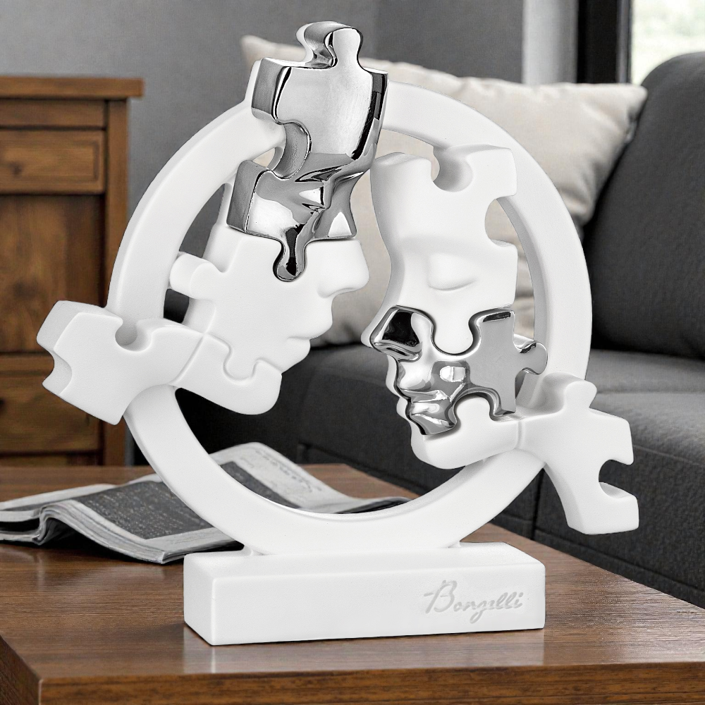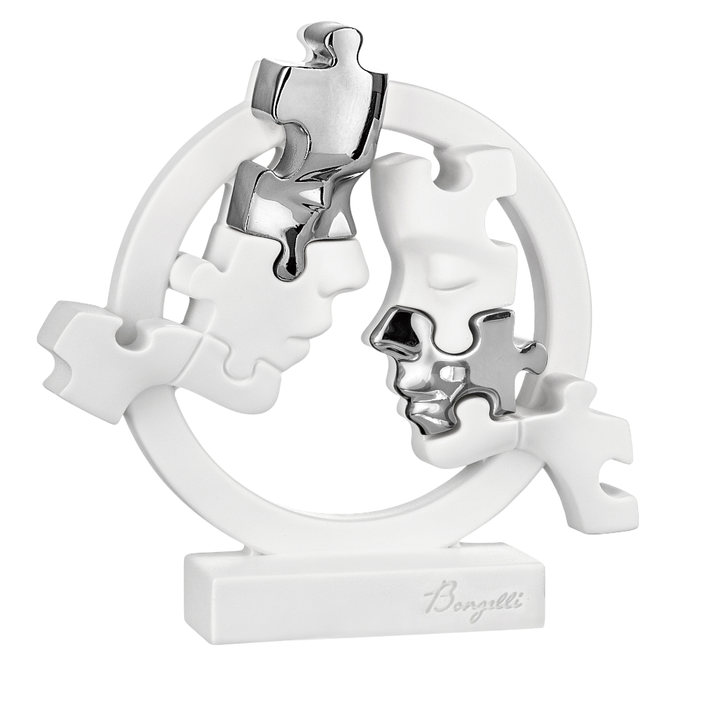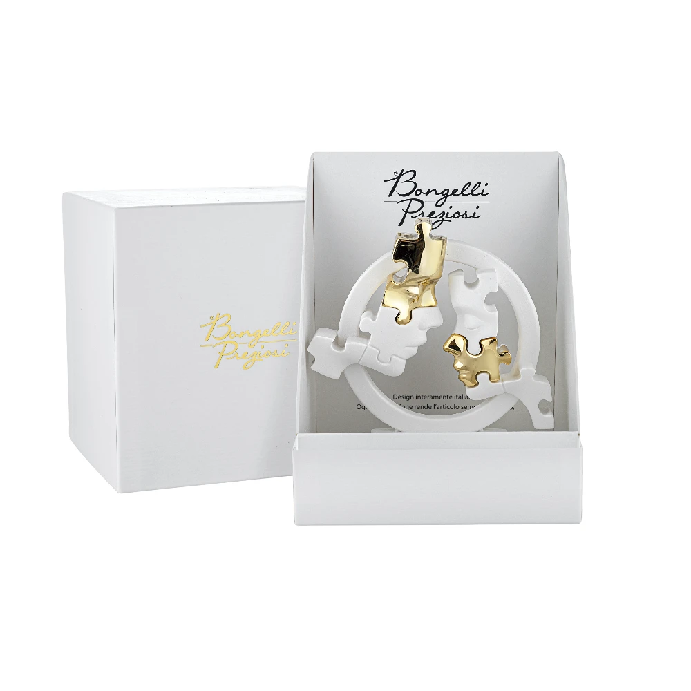 I Visi Puzzle Cerchio D.13 Bianco Argento di Bongelli Preziosi rappresentano l’incontro perfetto tra due anime che si completano. Le figure stilizzate, composte come tessere di un puzzle all’interno di una forma circolare, esprimono il concetto di unione, armonia e legame profondo, rendendo questo oggetto ricco di significato simbolico.