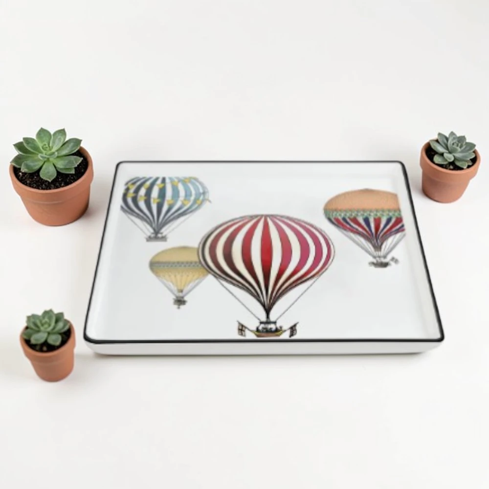 Il vassoio rettangolare si distingue per le sue splendide illustrazioni di mongolfiere colorate, simbolo di leggerezza e libertà. I dettagli grafici, curati con precisione, valorizzano la superficie bianca della porcellana, creando un contrasto armonioso e moderno. Il bordo sottile, rifinito con una linea scura, aggiunge un tocco elegante e definito al design complessivo.