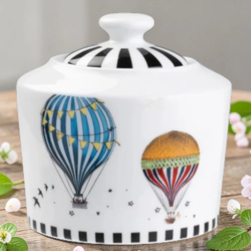 La superficie della zuccheriera è impreziosita da splendide illustrazioni di mongolfiere colorate, che evocano un senso di leggerezza e libertà. I dettagli curati, come le linee sottili e i motivi decorativi, rendono questo oggetto un vero elemento di design. Il contrasto tra il bianco lucido della porcellana e i colori vivaci delle mongolfiere crea un effetto visivo armonioso e moderno.