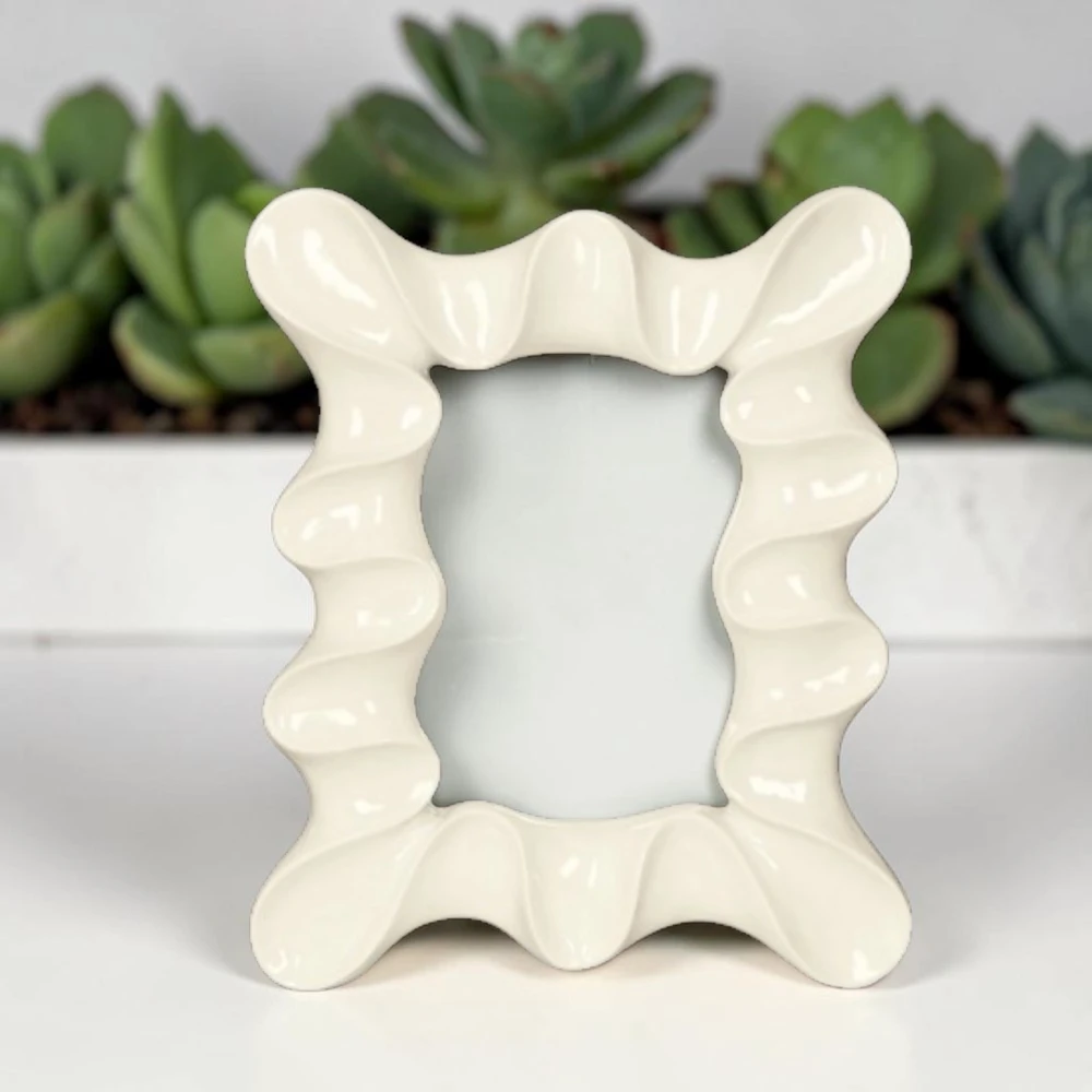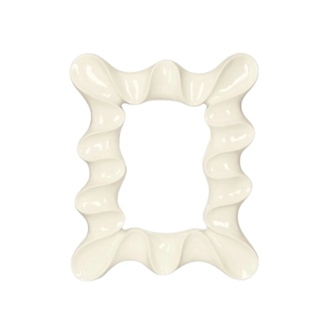 Il portafoto si distingue per la sua forma unica e sinuosa, caratterizzata da linee morbide e ondulate che creano un effetto tridimensionale elegante e moderno. Il colore avorio lucido dona luminosità e sobrietà, rendendolo ideale sia per ambienti classici che contemporanei. Questo design essenziale ma ricercato trasforma il portafoto in un vero oggetto decorativo.