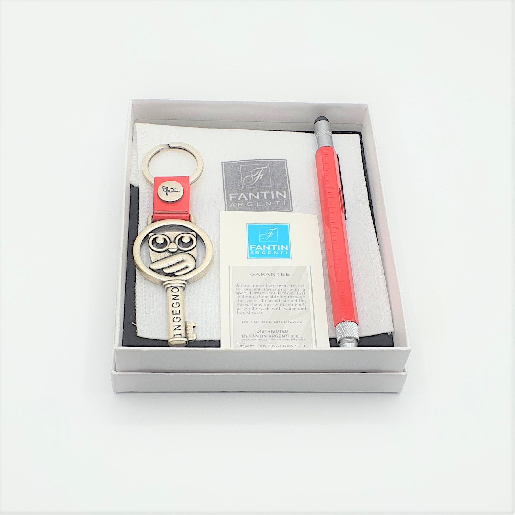 Il portachiavi con il gufo Fantin Argenti è made in Italy ed è caratterizzato da una chiave con scritta “ingegno” e con gufo e e penna abbinata. L’articolo è realizzato in acciaio rivestito in argento bilaminato anticato e pelle rossa. Completo di confezione, certificato di garanzia.