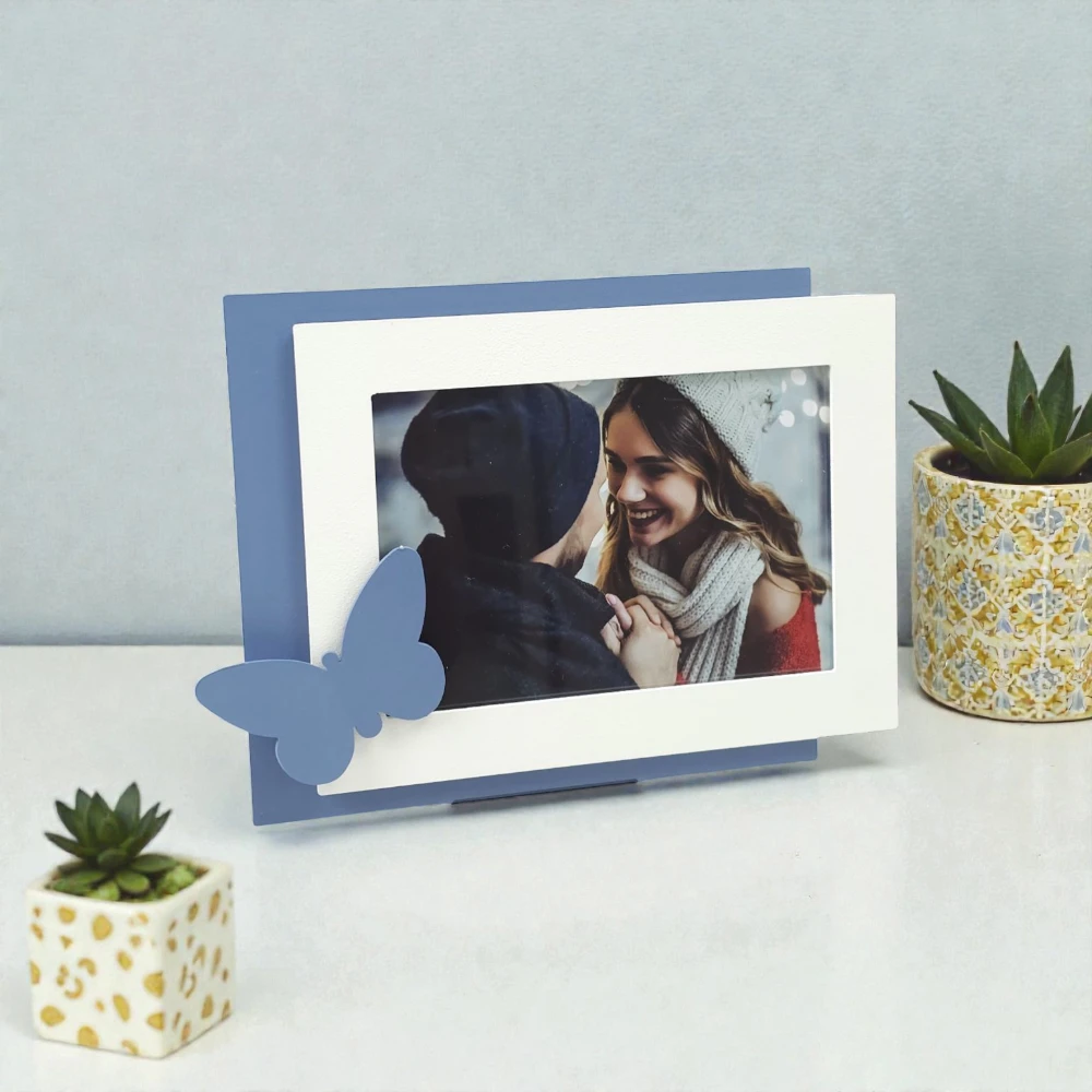 Il contrasto tra la struttura lineare della cornice e l’elemento decorativo laterale crea un effetto visivo equilibrato e contemporaneo. La farfalla, simbolo di trasformazione e leggerezza, rende questo portafoto ideale per ambienti dallo stile moderno, shabby chic o minimal. Le linee essenziali permettono di adattarlo facilmente a soggiorni, camere da letto, ingressi o studi professionali.