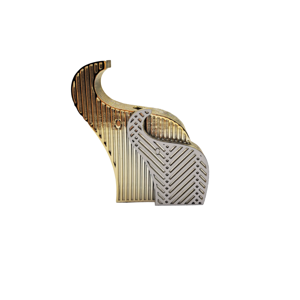 Profumatore con coppia di elefanti, entrambi decorati rispettivamenti da colore oro e argento con linee geometriche. I colori e la lumonistà sono la caratteristica principale di questo articolo, oltre alla fragranza compresa nel kit essenza. Dimensione: h. 30 cm