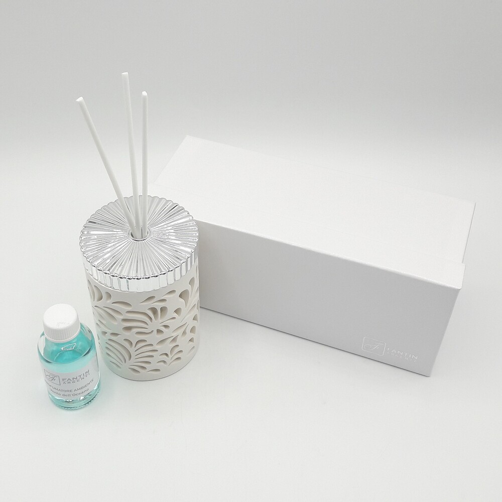 Il profumatore è realizzato in ceramica bianca con decorazioni di foglie traforate e parte superiore in argento. Kit essenza compreso. Dimensione: 6 x h 10 cm