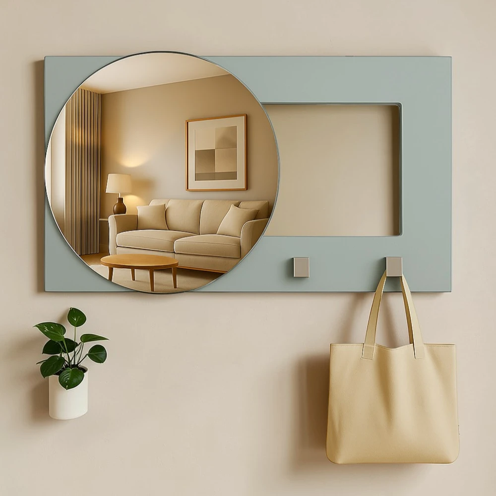 Oltre alla sua funzione estetica, questo specchio da parete è progettato per offrire anche praticità quotidiana. Il pannello include elementi utili per organizzare piccoli oggetti o accessori da ingresso, permettendo di mantenere l’ambiente ordinato. È perfetto per appendere borse, accessori o oggetti di uso quotidiano, rendendo l’ingresso della casa più funzionale e accogliente.