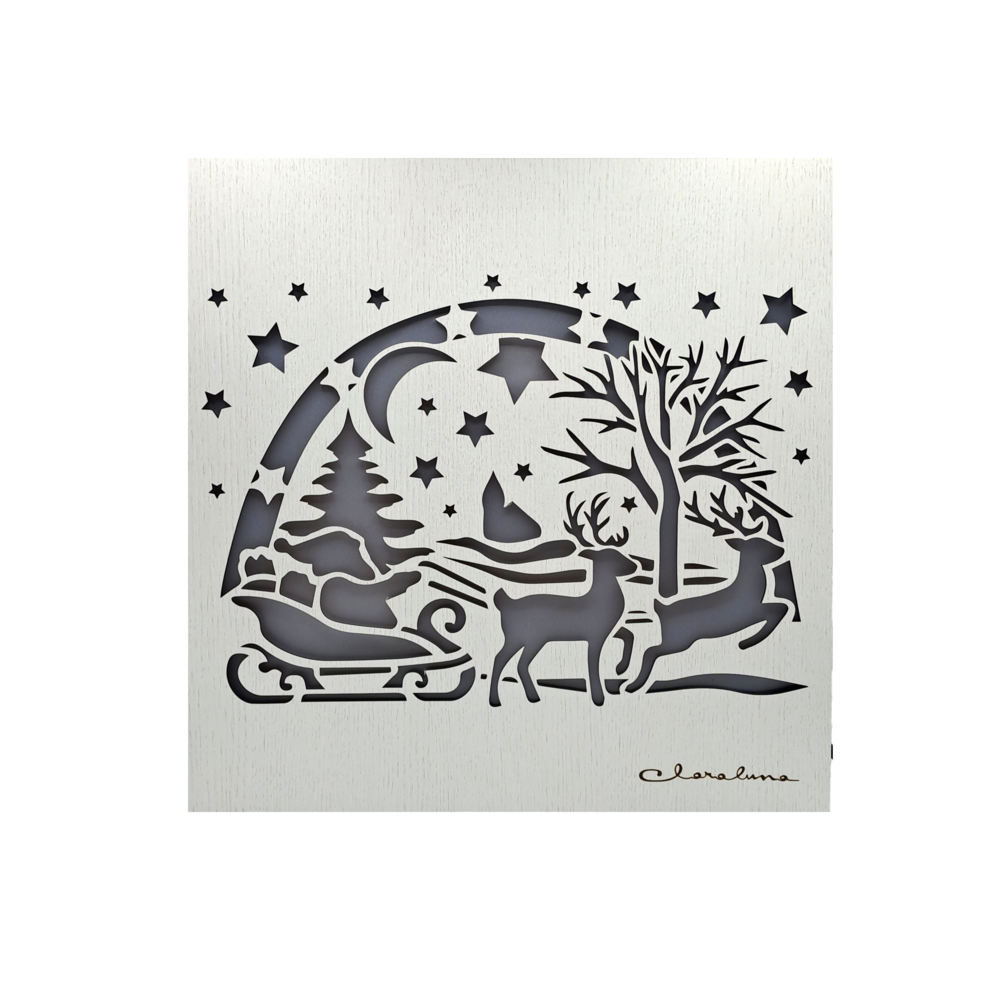 Pannello con decorazioni che rappresenta Santa Claus con le slitte. La luce calda dona importanza all’articolo, ideale per essere acceso nei momento di celebrazione delle feste natalizie, in compagnia o per decorare gli ambienti di casa. Dimensione: 40×40 cm