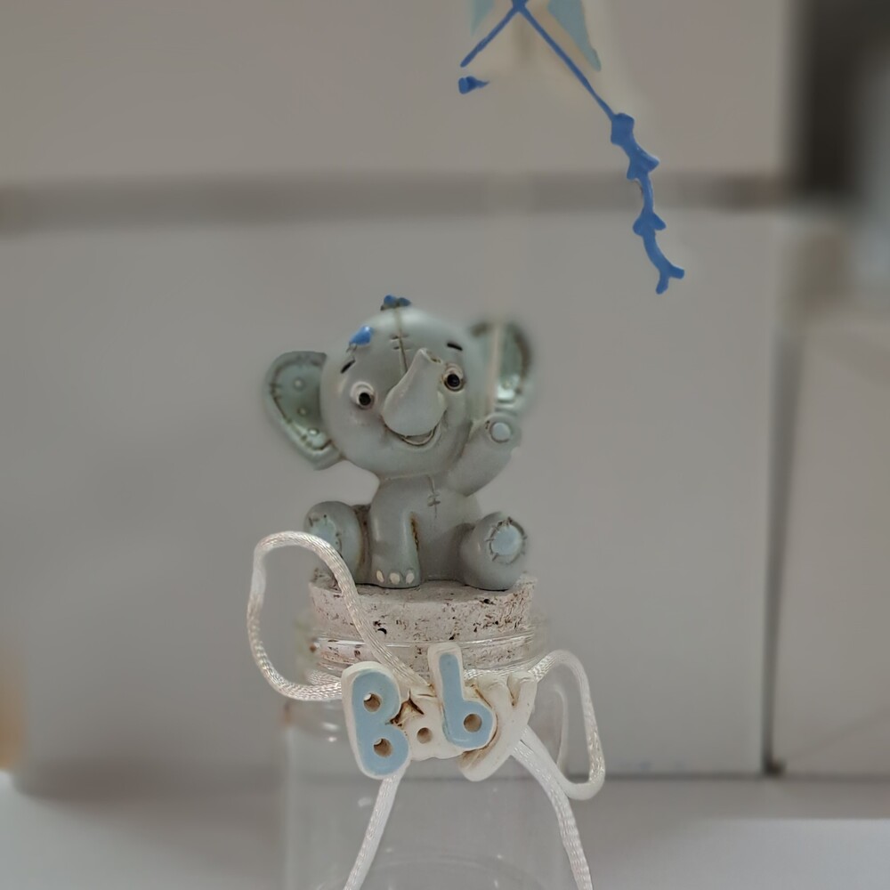 Set 5 Barattolini porta confetti con decorazione di elefante sulla parte superiore del tappo in sughero. Perfetto come dono da regalare al momento della nascita, o per conservare i confetti.