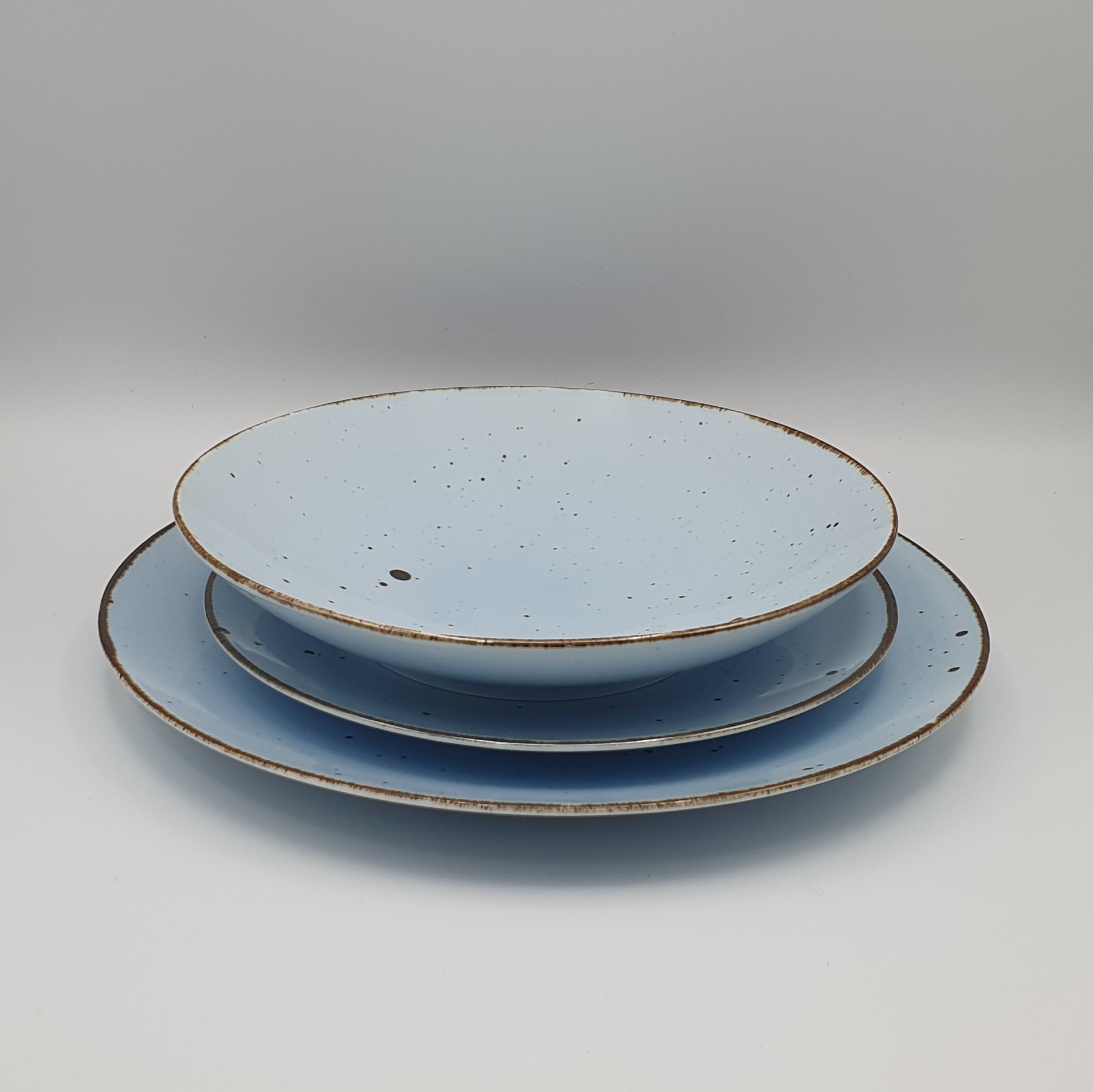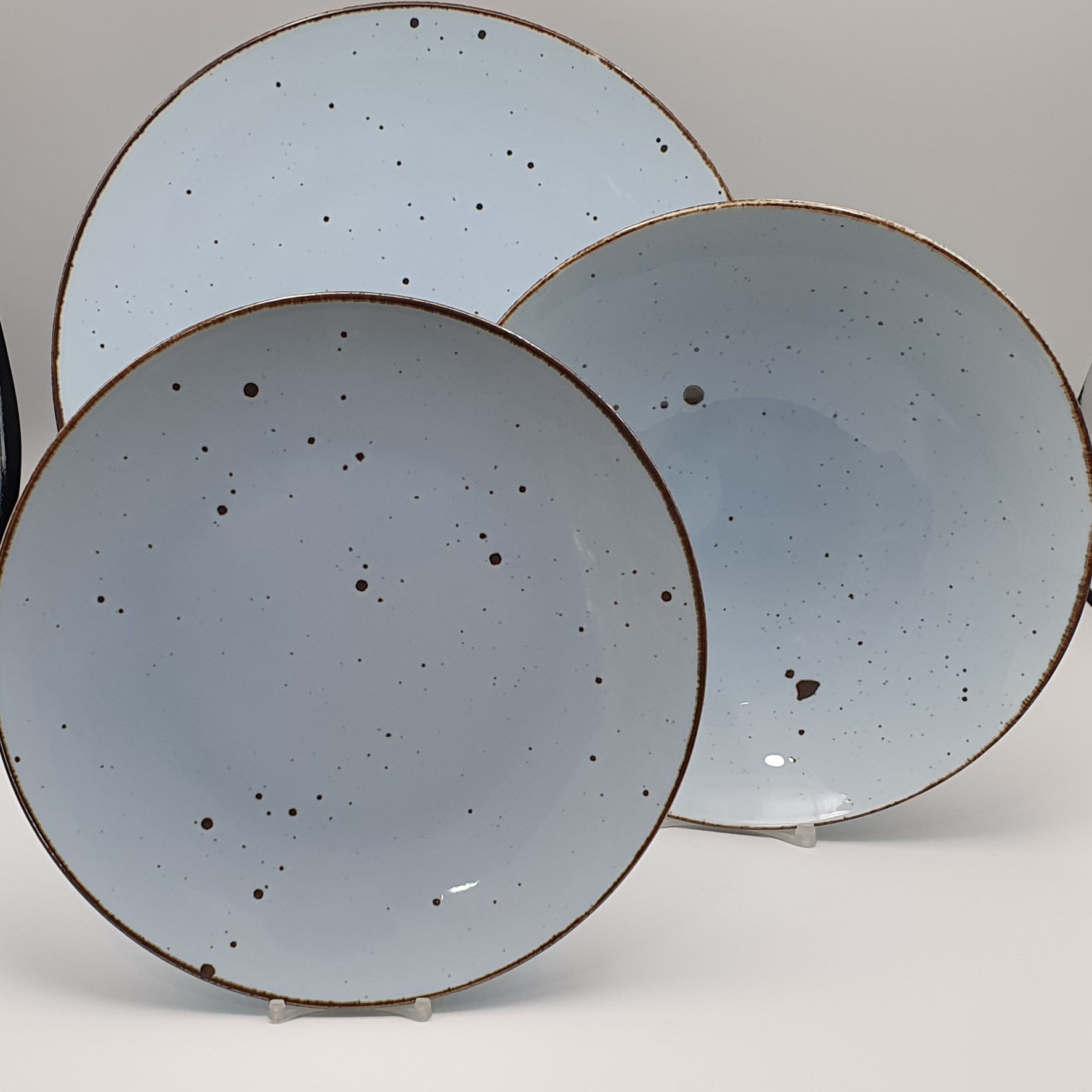 Tavola 18 pezzi Weissestal della collezione Cottage Sky. Il set si compone di 6 piatti fondi, 6 piatti piani, 6 piatti frutta. I prodotti sono lavabili in lavastoviglie e di ottima qualità, come garantisce da anni la firma Weissestal.